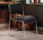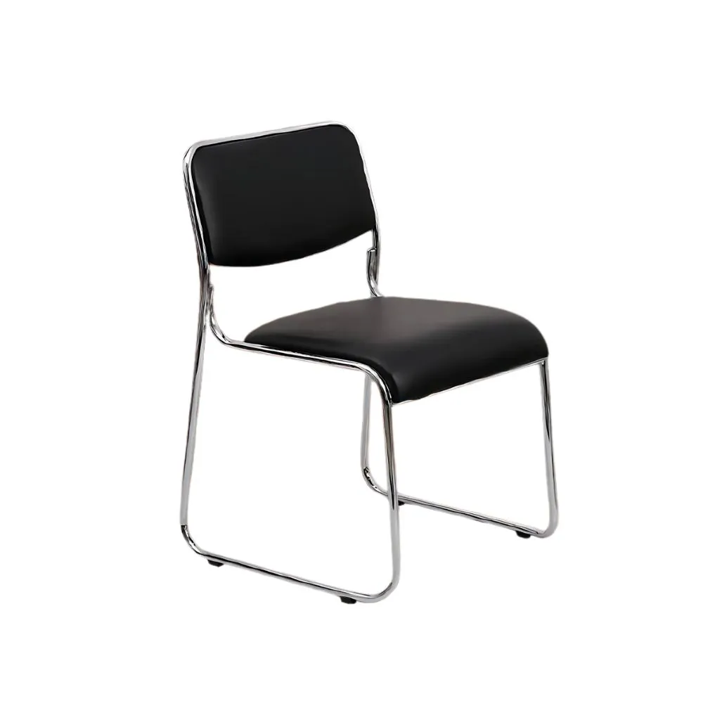 Esta silla de oficina presenta un diseño sencillo y funcional, con un asiento y respaldo tapizados en cuero negro, ofreciendo comodidad y un aspecto profesional. La estructura de la silla es de metal cromado, con un diseño de tubo continuo que forma tanto la base como los reposabrazos, lo que le da un aspecto moderno y minimalista. La silla no tiene ruedas, lo que la hace estable y adecuada para reuniones o visitas cortas.