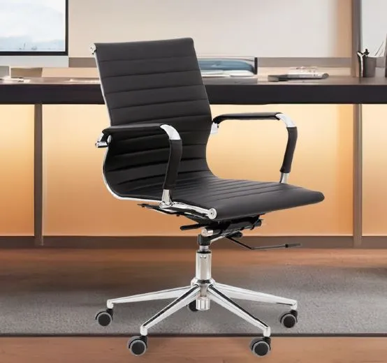 Esta silla ejecutiva combina elegancia y funcionalidad, ideal para oficinas modernas. Su asiento y respaldo están tapizados en material negro con un diseño de costuras horizontales, ofreciendo confort y estilo. La estructura metálica cromada incluye reposabrazos con recubrimiento acolchado para mayor comodidad. Cuenta con una base giratoria de cinco ruedas y un mecanismo de ajuste de altura, brindando movilidad y ergonomía. Su diseño sofisticado y minimalista la hace perfecta para espacios de trabajo profesionales.