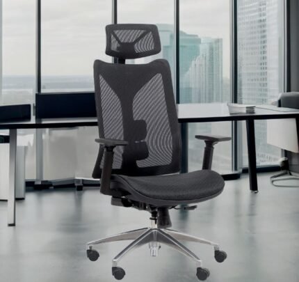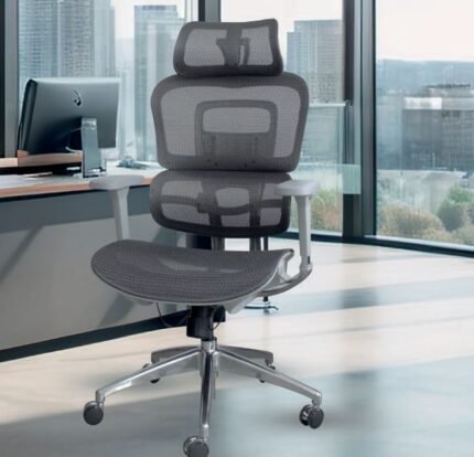 Esta silla de oficina ergonómica presenta un diseño moderno y funcional, con un respaldo alto de malla gris que ofrece transpirabilidad y soporte lumbar. El reposacabezas ajustable asegura una postura cómoda para el cuello. Los reposabrazos, de diseño curvo y color gris a juego con el respaldo, permiten personalizar la posición para mayor confort durante largas jornadas de trabajo. La base de metal plateado con ruedas facilita el desplazamiento y aporta estabilidad. El asiento, de tela gris a juego con el respaldo, complementa el diseño elegante y profesional de la silla. El entorno de oficina moderno y luminoso, con grandes ventanales y una alfombra azul texturizada, realza la estética de la silla y crea un ambiente de trabajo agradable.
