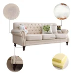 Este producto es un sofá de estilo clásico y contemporáneo. Este sofá combina un diseño clásico inspirado en los sofás Chesterfield. Los detalles capitoné y el terciopelo evocan lujo y tradición. Es ideal para interiores que buscan un equilibrio entre elegancia clásica y toques contemporáneos. Funciona bien en ambientes clásicos, modernos, glamurosos o minimalistas, dependiendo de cómo se combine con otros elementos. Con patas de madera con un estilo clásico con una forma circular, incluye deslizadores en la parte inferior, para evitar rayaduras en el piso.
