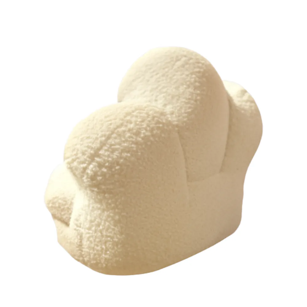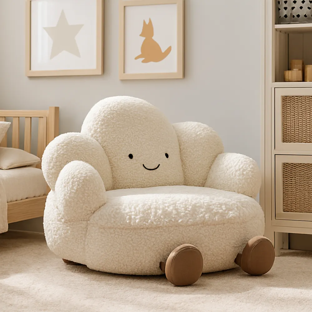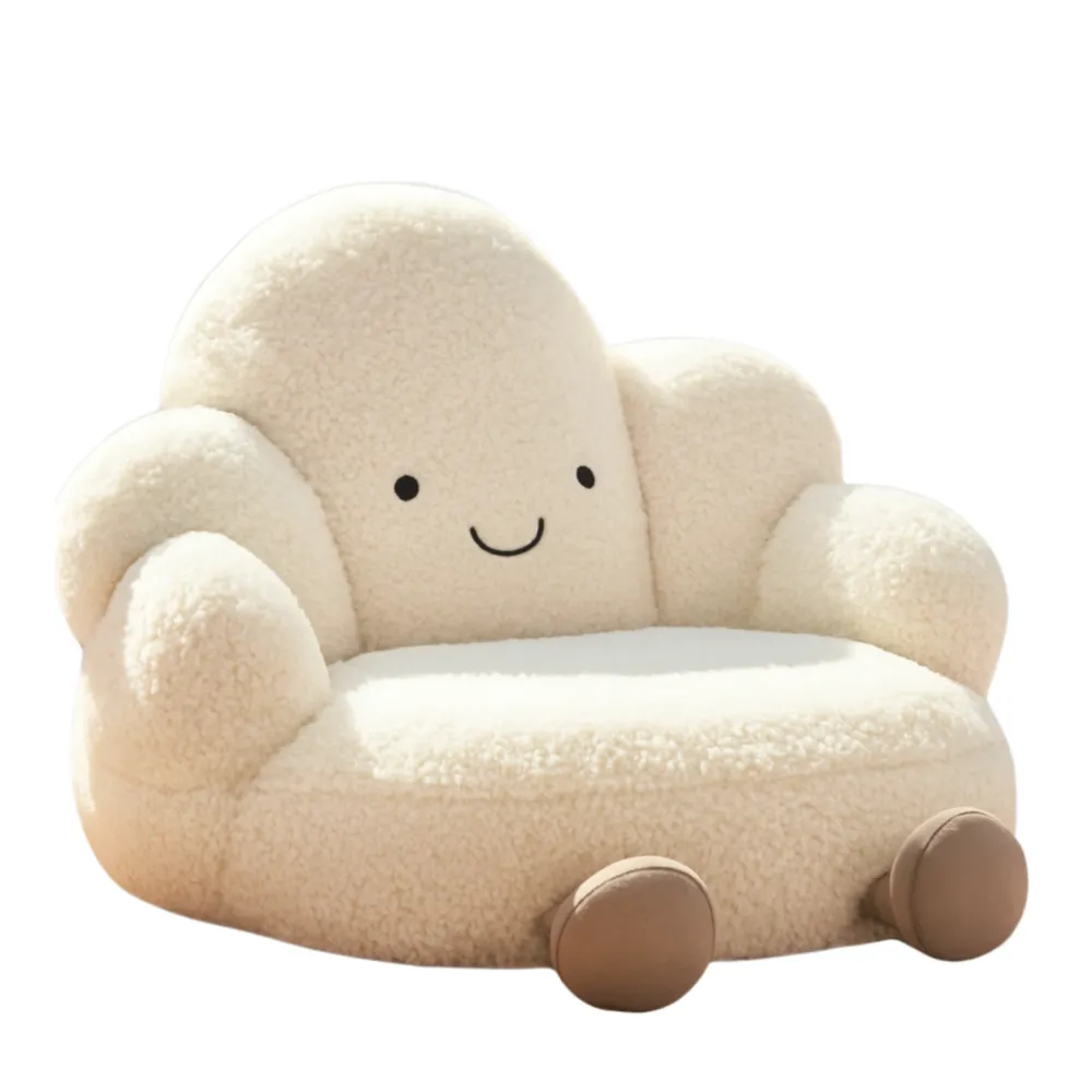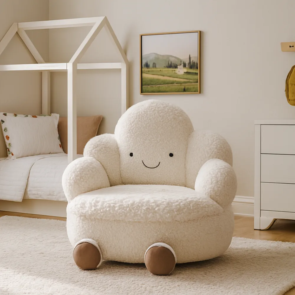 El mueble es un sillón infantil con un diseño original y divertido, inspirado en una nube. Su tapizado suave y afelpado en color blanco crea un ambiente acogedor y mullido. Los detalles bordados de una cara sonriente añaden un toque lúdico y amigable, perfecto para los niños.