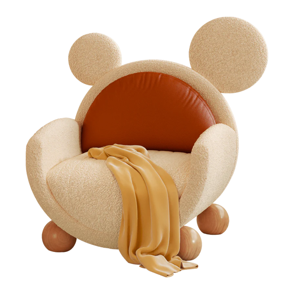El mueble es un sillón infantil con un diseño original y divertido, inspirado en un oso de peluche. Presenta una estructura tapizada en un tejido suave y afelpado de color crema, con un respaldo en forma de media luna y dos orejas redondas que sobresalen en la parte superior.