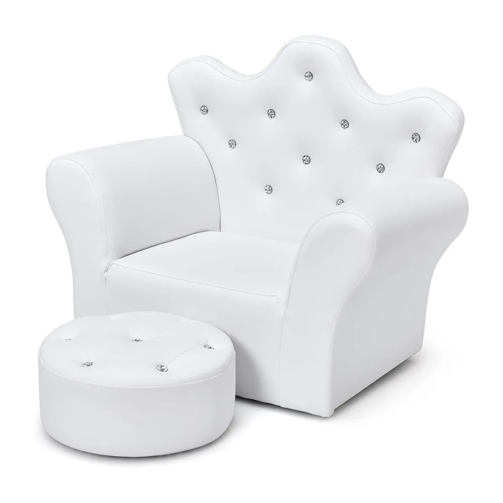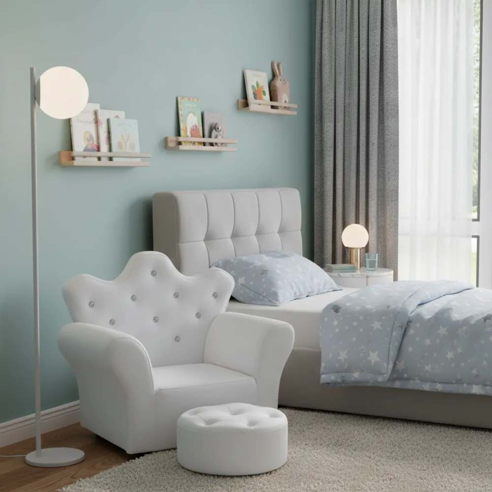 Este elegante sillón infantil con diseño de corona es perfecto para agregar un toque de encanto y sofisticación al espacio de los más pequeños. Su estructura ergonómica brinda comodidad y soporte, permitiendo que los niños se relajen mientras leen, juegan o descansan. Los detalles acolchados en el respaldo, decorados con aplicaciones brillantes, realzan su estilo refinado y llamativo. Incluye un pequeño reposapiés a juego, ofreciendo un extra de confort. Fabricado con materiales duraderos y fáciles de limpiar, este mueble es ideal para habitaciones infantiles, salas de juego o rincones de lectura. Su diseño majestuoso y acogedor lo convierte en un elemento decorativo y funcional.