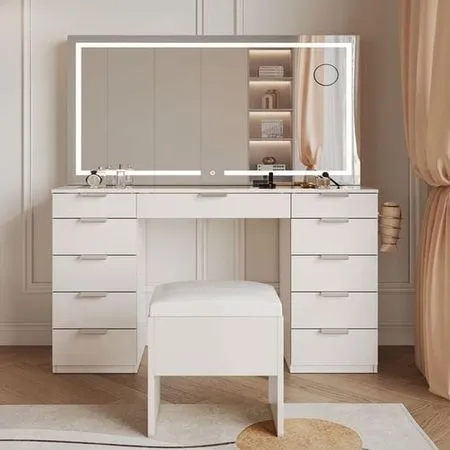 El espejo central de gran tamaño permite una visibilidad óptima, facilitando el proceso de maquillaje y arreglo personal. A cada lado, cuenta con estanterías abiertas que ofrecen un acceso rápido a perfumes, cremas, accesorios y otros artículos de uso diario. Además, los múltiples cajones proporcionan espacio suficiente para mantener el área ordenada, permitiendo guardar desde herramientas de maquillaje hasta documentos o joyería.