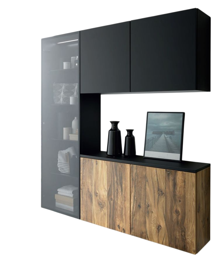 Esta moderna vitrina de cocina combina módulos superiores negros mate con una vitrina vertical de puerta de vidrio oscuro a la izquierda, revelando estantes interiores. A la derecha, un módulo horizontal más ancho con acabado en madera texturizada y una superficie superior negra sirve como encimera para elementos decorativos.