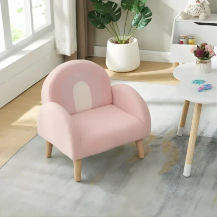 Este sillón infantil está diseñado para la comodidad y el disfrute de los niños pequeños. Su estructura está tapizada en un tejido afelpado de color rosa, creando un ambiente cálido y acogedor. El respaldo presenta un diseño de arcoíris con franjas en diferentes tonos de rosa, añadiendo un toque lúdico y original.